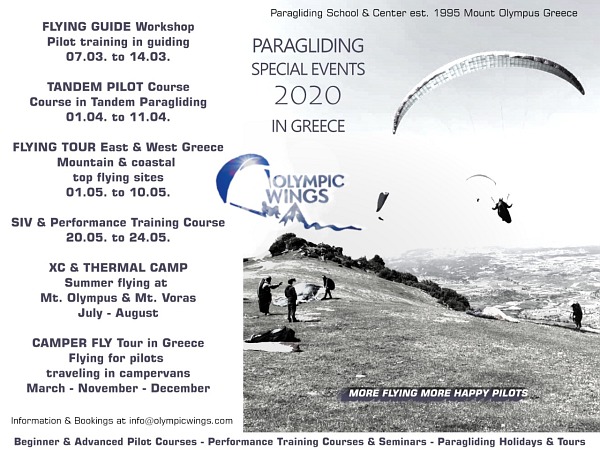 Flying Announcement Poster 2020 for Paragliding Special Events organized and offered in Greece by Olympic Wings.